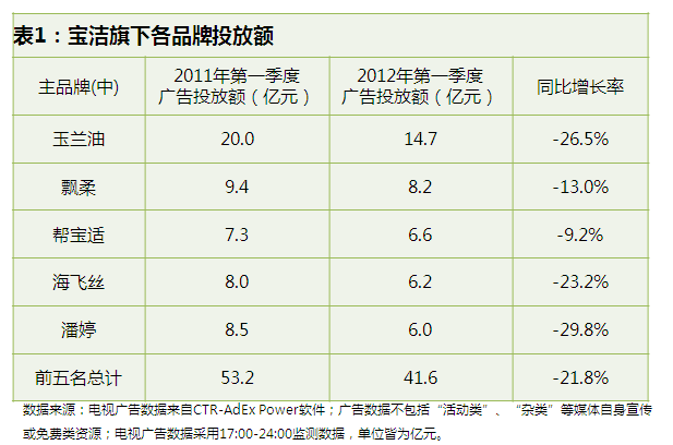 在电视媒体,五大传统行业的投放额占到电视广告总体投放额的64.5%,化妆品行业领跑广告投放,但从增长情况看,投放明显收缩,宝洁做为这一行业的的主力投放广告主,其市场份额从2011年一季度的35%下降到了25%,从宝洁旗下各品牌花费看,洗发护肤品牌广告花费全线直降,各品牌广告投放策略有所调整(见表1);另外,药品、交通、家用电器和房地产行业呈现不同程度的下降,整体投放力度明显缩减;随着人们消费、理财观念的转变,部分中高端人群对理财产品的需求仍在持续,金融行业广告投放保持着较高增长(见图4)。