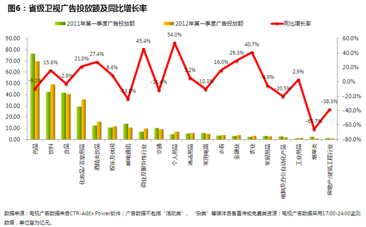 在央视各行业广告投放变化中,酒类广告继续维持着高幅度的增长,增幅为33%,成为央视投放额最大的行业。在整体投放靠前的行业中,饮料和交通行业呈现负增长;而药品、邮电通讯、商业及服务性行业和房地产行业广告投放的增长幅度都在25%以上(见图5),节假日是电子类产品和服务业的销售旺季,因此广告投入费用增加。2012年,广电总局双限令下,各卫视积极推出新编排,在保留一两档王牌节目的同时,进一步开创新的节目形式,强势卫视广告资源含金量稳步上升,广告主们更青睐稀缺资源为市场带来的附加值,同时省级卫视一批有影响力有特色的栏目凭借自身的实力和品牌力量赢了得更多的个人用品广告客户,与去年同期相比,个人用品行业同比出现50%左右的强劲增长,而药品、食品、邮电通讯和交通行业的广告投放的下滑给省级卫视带来直接影响(见图6)。