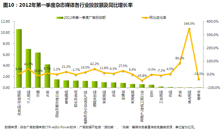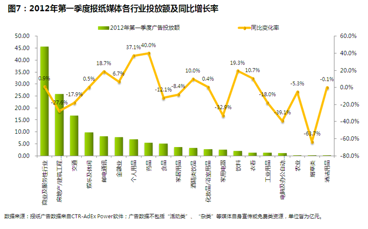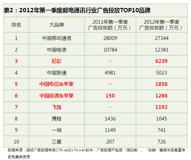 2012年一季度,个人用品和药品行业同比增长率为40%左右,是报纸广告增长最快的行业,医药企业是一个对广告非常依赖的行业,而只有重复才能让消费者记住、相信,才会产生购买欲,而电视广告受到时间的限制,媒体价格也越来越高,报纸凭借着价格低廉、易保存、不受时间限制、可反复阅读等特点,成为企业所乐于采用的媒体之一。随着通讯行业快速发展,手机消费市场的强劲需求刺激广告市场的敏感神经,邮电通讯行业同比增幅18.7%。从TOP10品牌看,中国电信、中国联通为配合iPhone4S的上市,都加大了广告的投放力度,以促进移动业务发展;而尼彩和飞炫做为新品牌,以整版的版面用文字和图片详细介绍,进行了较大量的广告投放,吸引顾客的眼球(见表2)。