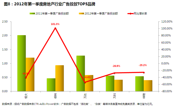 面对日益复杂的媒体环境,传统报纸的生存空间受到挤压,过去受众所接受的信息主要来自报纸,读报是大多数人的生活习惯,而今更多的人选择通过手机、互联网等媒体进行阅读,新兴媒体在分流受众群的同时也分流了大量广告主的广告投放预算,2012年第一季度报纸广告的增长率呈现负增长,是所有媒体中最低的。商业及服务性行业、房地产和交通行业依然是报纸广告的主要收入来源,但广告投放额大幅度缩减(见图7);由于宏观政策的制定面还会坚持控制房地产过热现象,老百姓的持币待购现象还在继续,恒大、万达、万科和绿地等品牌开发商纷纷缩紧广告投放,与去年同期相比,下降幅度都在40%左右(见图8); 随着电子商务挤压传统销售渠道,苏宁、国美、大中三大巨头在报纸的广告预算也在收缩,这对报纸广告整体收入造成较大的影响(见图9)。