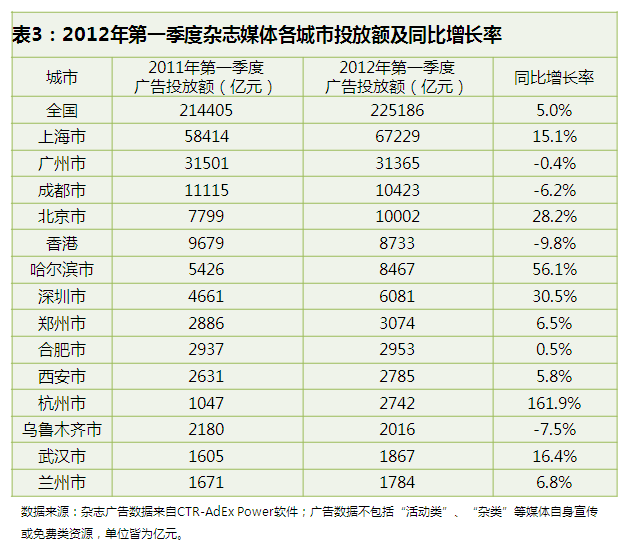 杂志的广告客户继续以日化行业为主,个人用品行业以41.7%的增幅拉动了广告收入的增长,随着年轻都市白领的个性意识和品位的不断提升,珠宝、钟表、箱包等高档产品越来越受青睐(见图10)。从各城市投放趋势来看,二三线城市向上势头迅猛,杭州增长幅度最高,同比增长160%,哈尔滨的增幅也在50%以上(见表3);各大奢侈品牌已经瞄准了二线城市,并争先开设品牌精品店,而杂志是与二线城市奢侈品消费者沟通关键的媒介渠道。