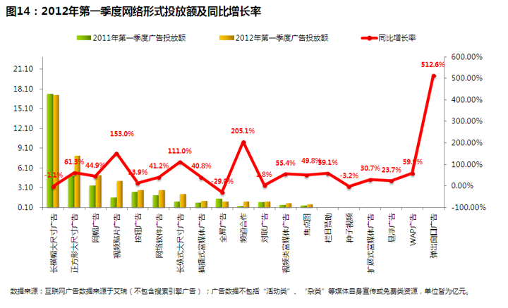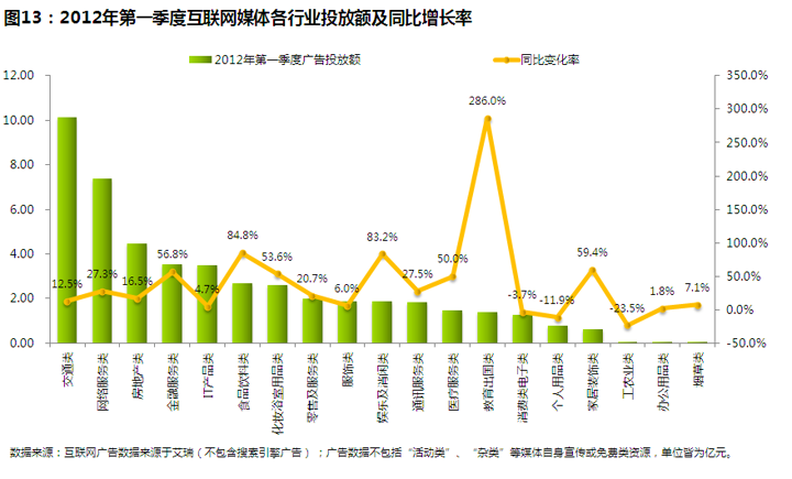 2012年一季度,互联网广告同比增长25.9%,交通类、网络服务类、房地产及金融服务类行业仍是网络广告的主体行业,占据整个互联网广告总量的半壁江山,金融服务类增长率最高,同比增幅56.8%;由于团购血拼时代结束,B2C的高速增长期已经接近了尾声,在众多风险投资商跟风撒钱的投资热潮退烧的情况下,网络服务类广告逐渐趋于平缓;而传统的食品饮料、日化、娱乐及休闲、医疗行业的增长率高达50%以上(见图13),由于广电总局出台“限娱令”、“限广令”的产业辐射力正在向视频网站蔓延,在线视频自制栏目又如雨后春笋般纷纷涌现,吸引了一批传统行业广告主加大了对视频网站的投放。