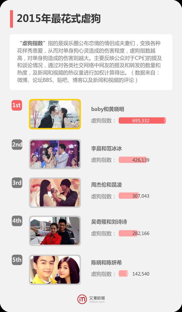 2015年娱乐圈喜事连连。5月29日,李晨在微博晒出和范冰冰的情侣照“我们”,公布恋情。但这对虐狗情侣的热度依然没有赶上教主和baby的“世纪婚礼”,黄晓明为爱妻豪掷千金,整个婚礼浩大奢华,细节无比精致,前去观礼的宾客更是占据娱乐圈半壁江山。而周杰伦小公举和昆凌,四爷若曦的恋情虽然热度没有前两对高,却也纷纷在今年修成正果,过儿和姑姑也马不停蹄地进展到求婚阶段。
