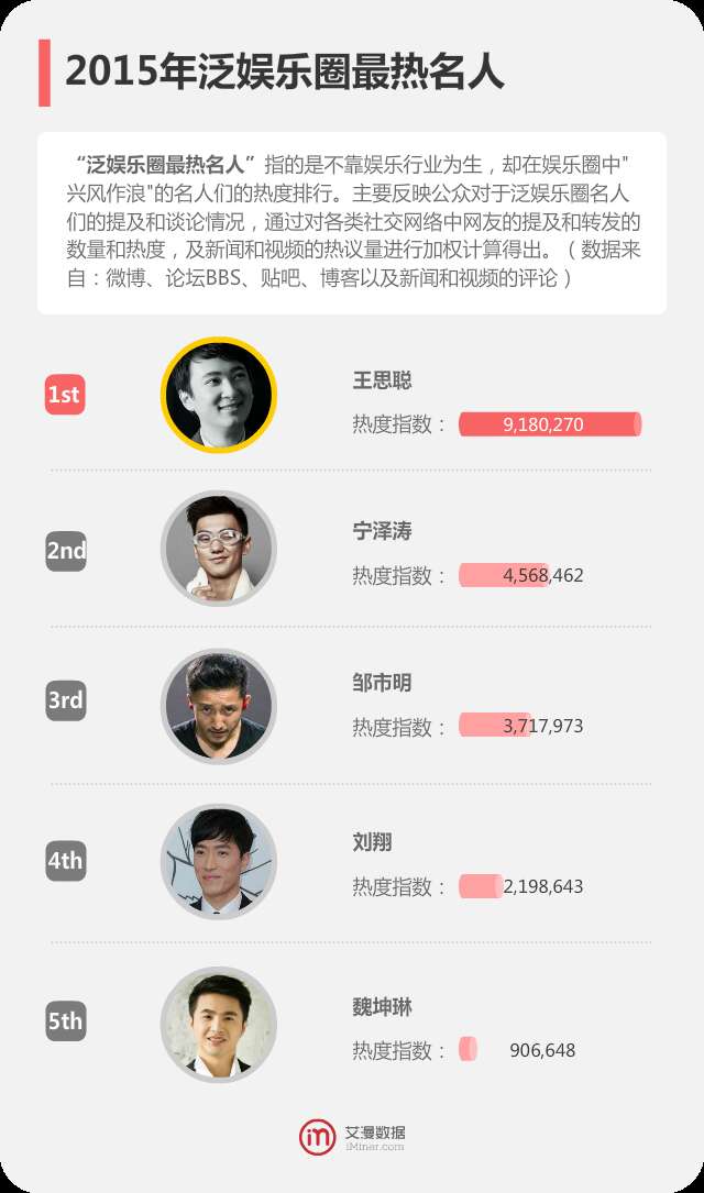 素以口无遮拦形象示人的“万达公子”王思聪,近年来,几乎是逢娱乐热门话题必开腔,罕有缺席,而中弹的节目、艺人不计其数。也正因其秉持“没事要惹事,事来了不怕事”的行事风格,他也被网民们戏谑地称作“娱乐圈纪检委”,当选2015“泛娱乐圈”最热名人。Po出腹肌照的泳坛小鲜肉宁泽涛,上综艺比擂台还多的邹市明,闪婚闪离的飞人刘翔以及刚与小四吵完架的Dr.魏,也均以高热度进入该榜单。