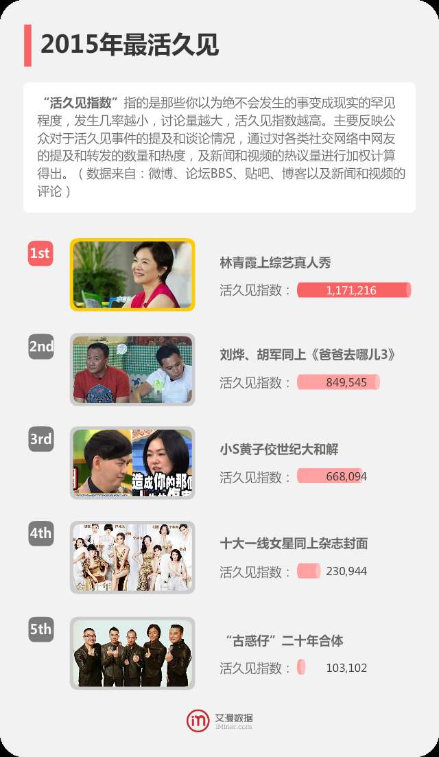 这一年,我们见证了五次“活久见”事件,所谓“活久见”,是指活得时间久了,什么事都能见到。例如,2015年就出现了以下“活久见”事件:国民女神林青霞上综艺真人秀,息影有二十余年的她在大家的眼中一直像世外高人,这一盛事一度被网友调侃称为“青霞下凡”。此外,刘烨胡军合体上综艺,小S黄子佼世纪大和解,十大一线女星同上杂志封面,“古惑仔”二十年首度合体,这些网友喜闻乐见的乐事都进入了“活久见”榜单。