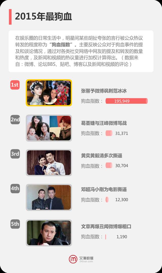 2015年,娱乐圈里的是是非非俨然一部宫斗大戏,除了撕逼大战不断上演,面和心不合的狗血斗争也是层出不穷。最狗血排行中热度前三均与前任有关,范爷和大黑牛恋情公布后,前任张馨予便不再消停,微博上或明嘲暗讽,或酸溜溜的祝福,这种女人纠结的爱恨情仇倒是将自己推上了几次娱乐头条。而汪峰与前妻葛荟婕、黄奕与前夫黄毅清的各自骂战,也纷纷引来网友的一片口诛笔伐。
