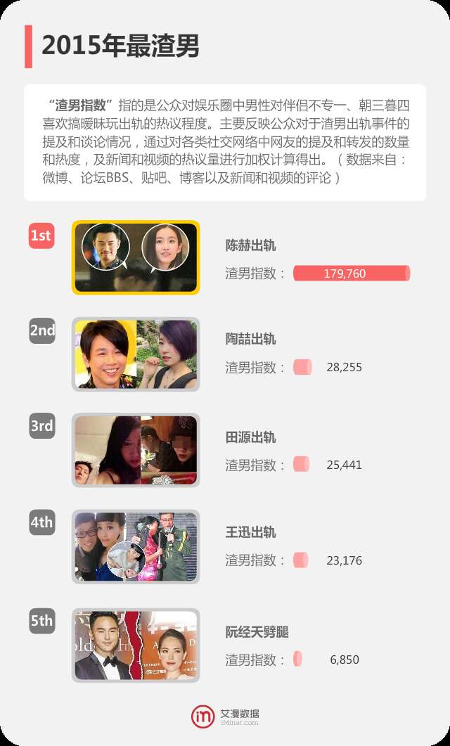 今年1月,陈赫被曝劈腿张子萱抛弃老婆许婧,从此沦为渣男。由于此前戏里戏外塑造的好男人形象深入人心,网友对其出轨行径义愤填膺愤愤不平,最渣男榜首位实至名归。无独有偶,6月底,网友爆出陶喆婚内出轨的风流韵事,此后陶喆还发表PPT详解出轨经过,并将出轨原因全部推到小三身上,这种不负责任的行为也是令网友惊呼“大开眼界”。此外,王迅抛弃身患疾病的糟糠之妻出轨90后女孩,主持人田源背妻与辣妹夜店激吻,阮经天勾搭内地女星的行径也纷纷帮助他们登上2015渣男榜。