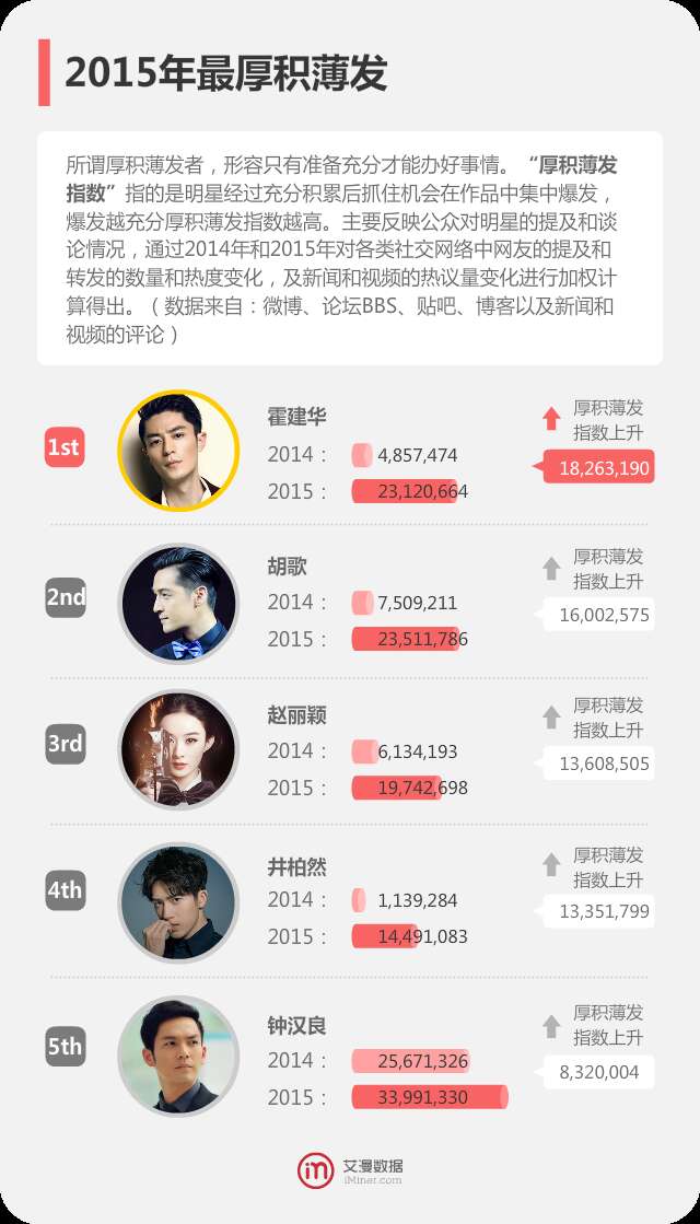 2015年的娱乐圈中,不乏一夜爆红,大富大贵者,但也有着不少凭借着自己努力,从最初的默默无闻一步一个脚印闯出一番名堂。2015年胡霍CP在演艺事业上的相继爆发,是对他们十年努力的最好馈赠;而出道八年一朝“井”喷的井柏然,也因今年《捉妖记》、《花儿与少年2》等多部作品一跃成为炙手可热的当红鲜肉。
