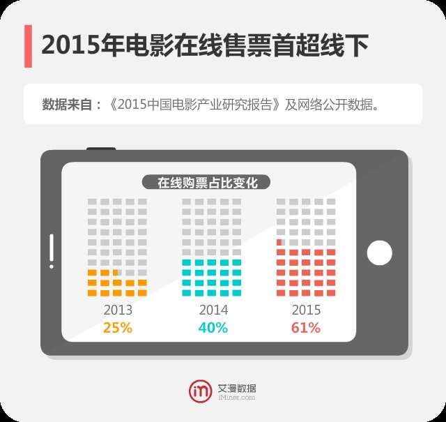 2015年,电影总票房达440.69亿元。值得注意的是,去年观众的购票方式在发生质的变化,在线购票占比60%以上,这是互联网改变生活消费模式的一次明显体现。猫眼电影、格瓦拉、微票儿等O2O购票网站的崛起,从根本上颠覆了传统的电影售票环节,重塑了电影放映市场的产业结构。随着院线开设的深入,观影热潮的继续升温,未来线上票务市场还将有更大的市场潜力可挖.