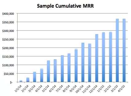 列举某公司通过月度订阅获得营收为例,为了更细化一些,假设这是一家B2B SaaS公司。对这样的公司而言,月活跃用户(MAU)增长和月常规收入(MRR)增长都是关注点。别忘了我们仍然关注月活跃用户(MAU)分析。如果当月流失用户,那么很可能对应的当月收入也会相应减少。现在,让我们来探究月常规收入(MRR)随时间推移呈不断上升状的图。