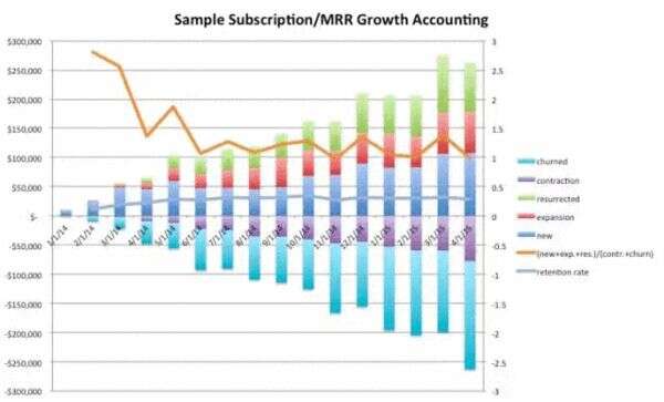 MRR(t) – MRR(t – 1个月) = 新用户收入 (t) + 唤醒用户收入 (t) +增加收入 (t) – 流失用户收入 (t) – 减少收入 (t)