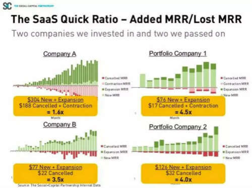 右侧两个公司是我们的被投企业,左侧两个则不是。左上方A公司讲的一口好故事,说他们的增加收入很多,一定意味着product-market fit良好。然而真实情况却是被减少的收入掏空,导致必须产生月增长收入来抵消月减少收入带来的不利影响,从而产生净增长。