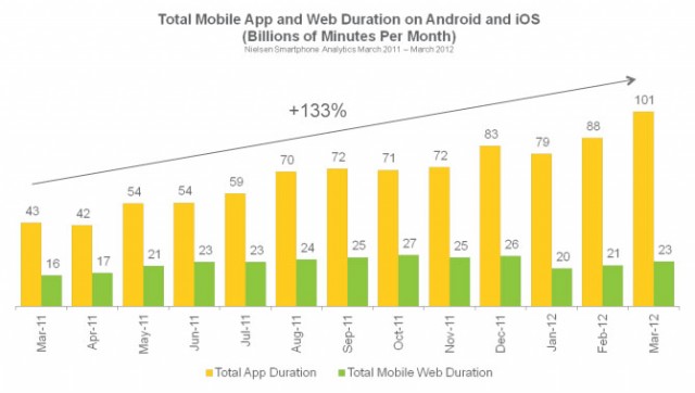 - 从去年3月到今年3月,用户用移动设备上网总时间增长44%,而用户花费在应用上的时间则增长133%;
