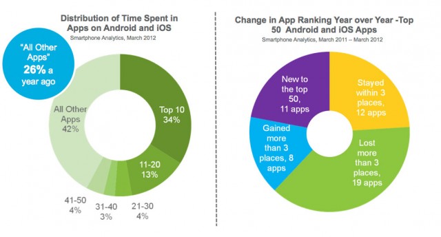 - 应用呈现长尾趋势:在2011年3月,Android和iOS用户花费在Top50应用上的时间比例为74%,现在仅为58%。
