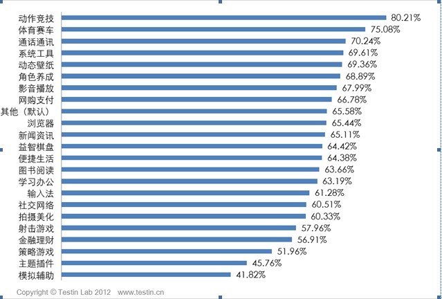 在所有参加终端测试表现数据显示,游戏厂商因为具备极强的营收能力,最为关注APP产品与移动终端的适配情况,其中动作竞技游戏、赛车类的游戏App在各类终端兼容性上表现最好;而打包党泛滥的模拟/策略类游戏则不理想;非游戏类APP产品与终端适配情况整体表现平平,分析认为与无法构建营收方式有关,并不特别注重用户体验。以下为详细图表: