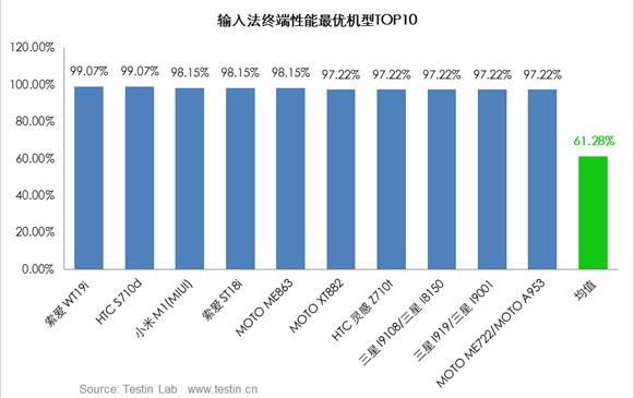 报告数据指出:索爱 WT19i是所有参加测试移动终端中输入法类APP产品的最优选机型,HTC S710d紧随其后,小米 M1(MIUI)第三。索爱 ST18i,MOTO ME863,MOTO XT882,HTC 灵感 Z710t,三星 I9108/三星 I8150,三星 I919/三星 I9001,MOTO ME722/MOTO A953分别进入TOP10。
