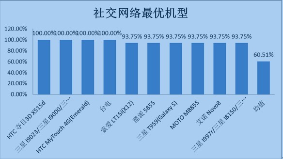 报告数据指出:HTC 夺目3D X515d是所有参加测试移动终端中社交网络类APP产品的最优选机型,三星 I9023/三星 I9000/三星 I9103/三星 I9108紧随其后,HTC MyTouch 4G(Emerald)第三。台电索爱 LT15i(X12)、酷派 5855、三星 T959(Galaxy S)、MOTO MB855、艾诺 Novo8、三星 I997r/三星 I8150/三星 I909分别进入TOP10。