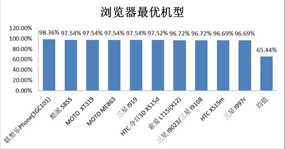 报告数据指出:联想乐Phone(3GC101)是所有参加测试移动终端中浏览器类APP产品的最优选机型,酷派 5855紧随其后,MOTO XT319第三。MOTO ME863、三星 I919、HTC 夺目3D X515d、索爱 LT15i(X12)、三星 I9023/三星 I9108、HTC X515m、三星 I997r分别进入TOP10。