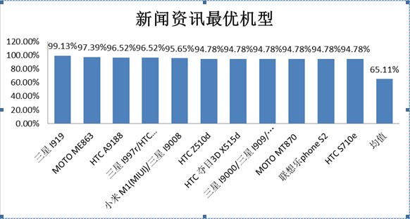 报告数据指出:三星 I919是所有参加测试移动终端中新闻资讯类APP产品的最优选机型,MOTO ME863紧随其后,HTC A9188第三。三星 I997r/HTC A9188/HTC S710d、小米 M1(MIUI)/三星 I9008、HTC Z510d、HTC 夺目3D X515d、三星 I9000/三星 I909/三星 I8150、 MOTO MT870 、联想乐phone S2、 HTC S710e分别进入TOP10。