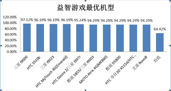 报告数据指出:三星 I9000是所有参加测试移动终端中益智游戏类APP产品的最优选机型,HTC S510b紧随其后,三星 I9023第三。HTC MyTouch 4G(Emerald)、HTC Desire Z/三星 I997r、酷派 5855/三星 I9003、MOTO Atrix 4G(ME860)、 酷派 D5800、HTC 夺目3D X515d/HTC C510e、艾诺 Novo8分别进入TOP10。