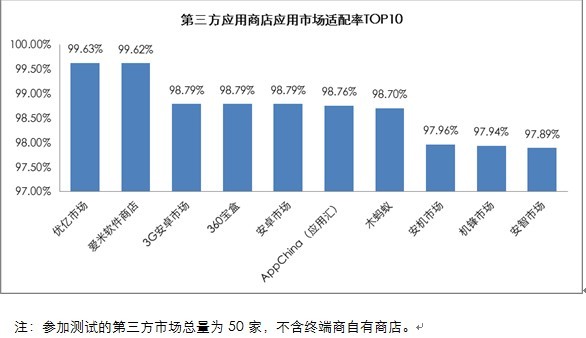 报告数据指出:优亿市场是所有参加测试移动终端中第三方应用商店应用市场适配率最优市场,爱米软件商店紧随其后,3G安卓市场第三。360宝盒、安卓市场、应用汇、木蚂蚁、安机市场、机锋市场、安智市场分别进入TOP10。