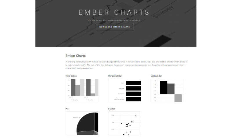 Ember Charts – 顾名思义是一种基于Ember.js框架和使用d3.js的可视化工具。Ember Charts以绘制时间序列图,柱状图,饼图和散点图为主。它非常优易于扩展。同为Ember.js开发团队,Ember Charts聚焦于图形互动性。它有极强的错误处理能力,当你遇到坏数据时,系统也不会崩溃。