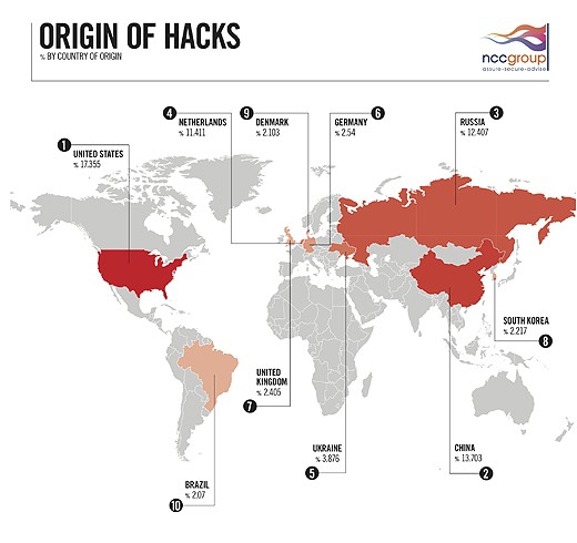 NCC Group的黑客事件发源地排行榜是各个国家黑客组织或个人对计算机攻击事件宣称负责的数量统计,每三个月更新一次,数据来自合作网络安全社区DSHield的入侵检测监控日志。本次的全球十大黑客事件发源地分别是美国、中国、俄罗斯、荷兰、乌克兰、德国、英国、韩国、丹麦、巴西。