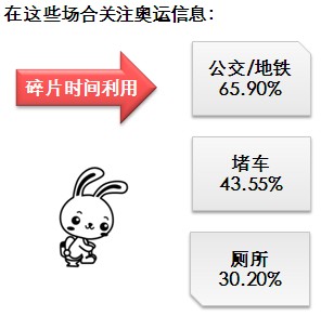 在本次调查中,有65.90%的手机人表示会在公交/地铁上关注奥运信息,43.55%表示会在堵车时关注奥运信息,特别的是,有30.20%的人会在厕所里关注奥运信息。手机让人们的碎片时间得以更充分地利用,奥运填补了人们的每一细小时间碎片。