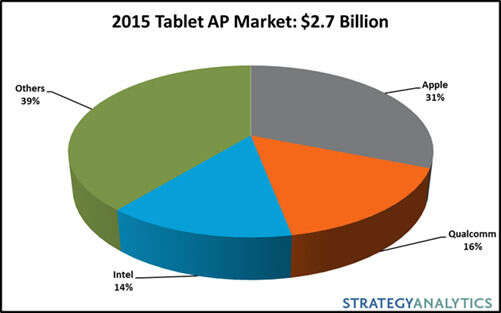 苹果iPad依然引领着2015年的平板市场(占31%),高通份额为16%,英特尔为14%,MTK则被远远甩在后面。整个市场萎缩了33%至27亿美元,这也是平板芯片的首次滑坡。