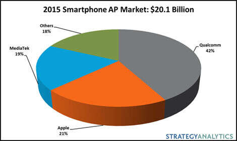 根据Strategy Analytics周五发布的数据:苹果把持了21%的智能机处理器市场,下滑了4个百分点至201亿美元;高通的份额为42%;联发科则是19%。尽管高通骁龙处理器有很大的市场基础,但其在2015年面临的激烈的竞争(包括三星的出货翻番)。英特尔顺利增长了66%,但仍仅占1个百分点。