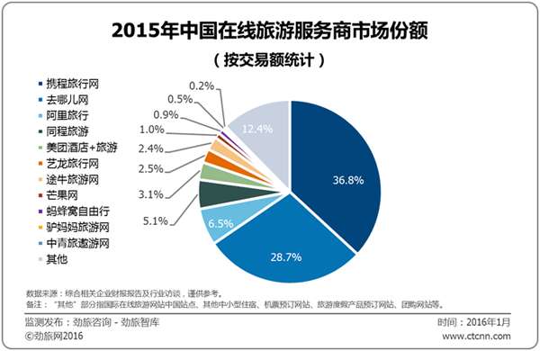 劲旅咨询-劲旅智库监测数据显示,2015年,中国在线旅游服务商市场总交易规模约为4672亿元,其中,携程旅行网和去哪儿网的交易额占比分别为36.8%和28.7%,阿里旅行与同程旅游的占比分别约为6.5%和5.1%,美团酒店+旅游、艺龙旅行网和途牛旅游网三家的占比分别为3.1%、2.5%、2.4%。