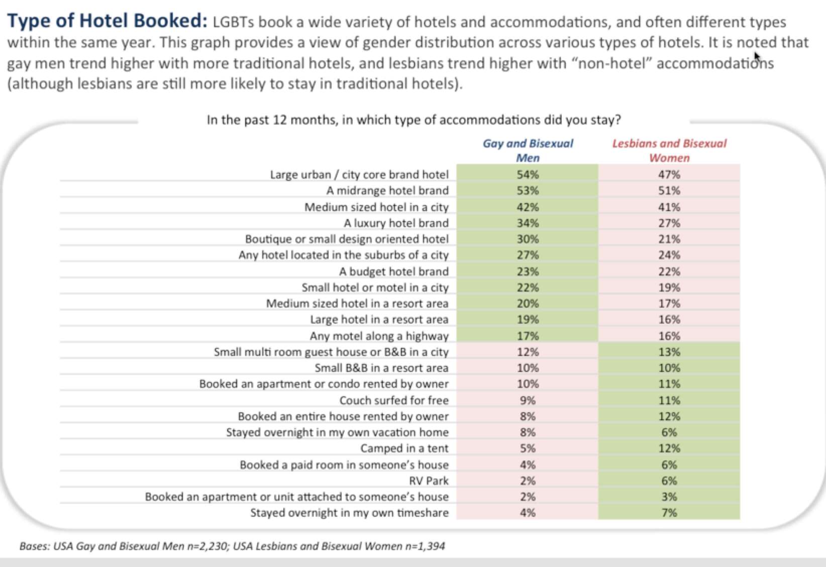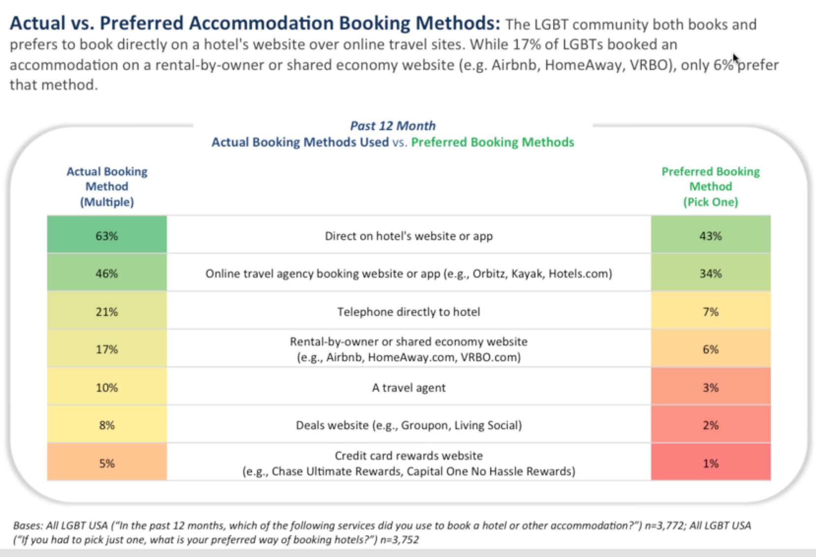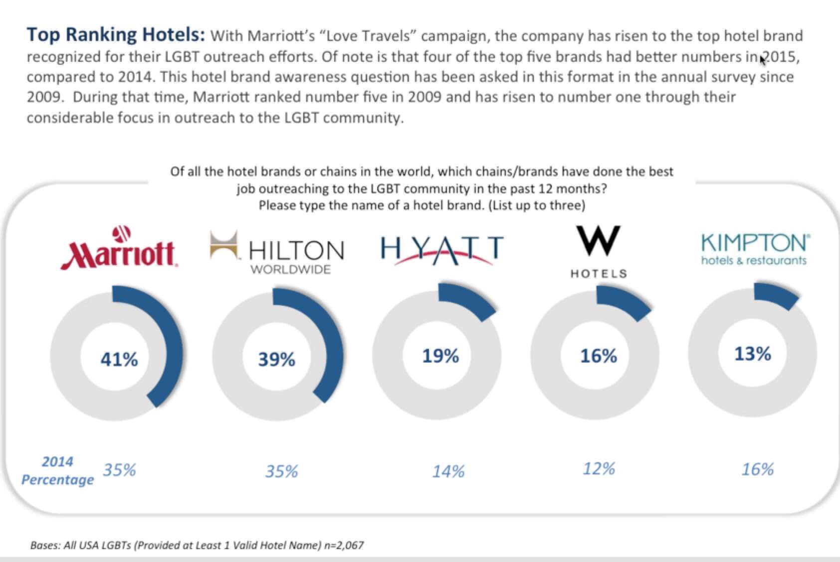 帮助品牌了解此市场群体的营销公司对LGBT游客的研究显示,酒店对LGBT友好的声誉是该群体预订酒店时的重要但非决定性因素。该公司最近调查了4600名年龄在18至65岁的美国同性恋游客,受访者中男同性恋者为57%,32%为女同性恋者。受访者表示位置和价值是预订酒店过程中的两个最重要的因素,而对LGBT友好程度的名声是第三重要的因素。