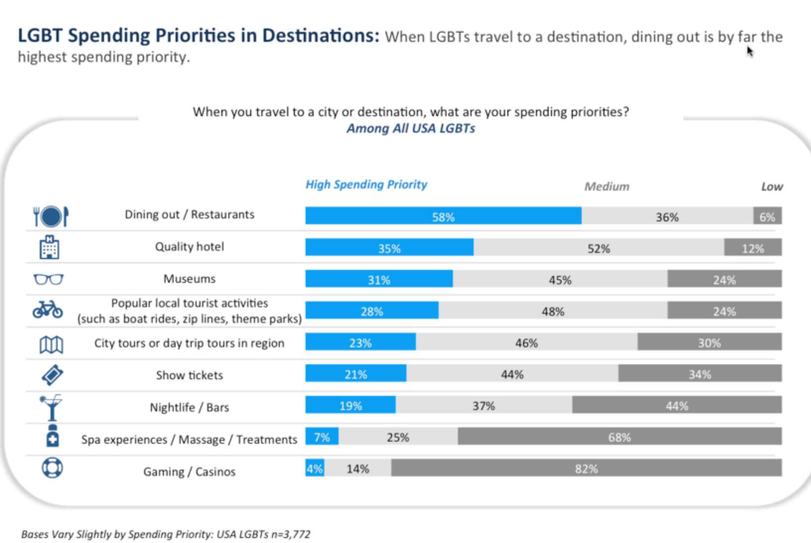 图4:58%的LGBT游客表示他们计划花在外出就餐和旅行中的钱最多,比其他如酒店质量和夜生活这样的活动都要多。