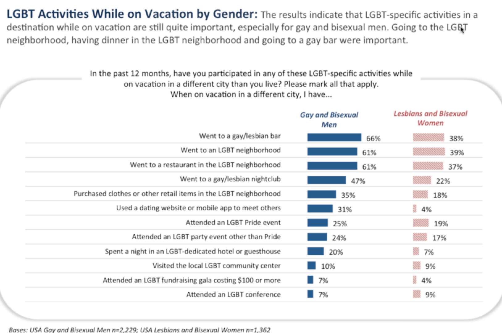 图5:与女同性恋和双性恋者相比,更多的男同性恋和双性恋者在上一次度假中体验了同性恋酒吧和同性恋社区。