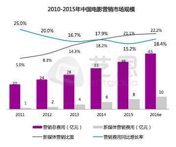 2015年中国电影票房突破440亿,电影营销市场预计达38亿元,同比增速21.1%,新媒体营销费用同比增长速度有所放缓,占营销费用的15.2%,但新媒体营销市场规模却在短短五年内实现了近8倍的增长,新媒体渠道在电影营销中的地位逐步提升。电影营销从初期的媒体中心期过渡到目前的电影中心期,观众渐渐对铺天盖地的网络营销产生免疫,吸引观众的因素回归到了电影本身。