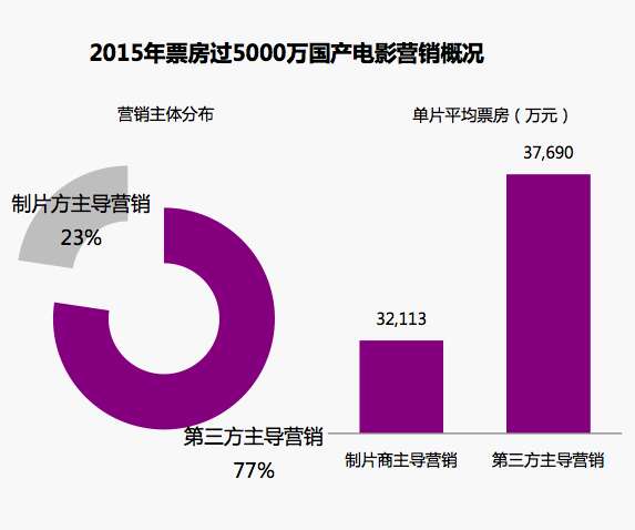 同时在2015年票房过5000万的国产电影共有67部,其中48部由第三方电影营销公司进行营销,19部由片方自行推广,第三方营销影片票房整体表现优于片方自行营销。