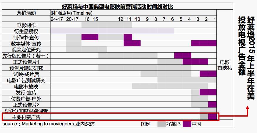 不同于内地,好莱坞电影营销早于电影制作启动,营销费用与制作费用的比例大约是1:2,一部大规模影片会在北美花费三千到五千万美元的营销费用,在全世界的营销花费一般在1亿美元左右,且电视渠道投入远高于国内。