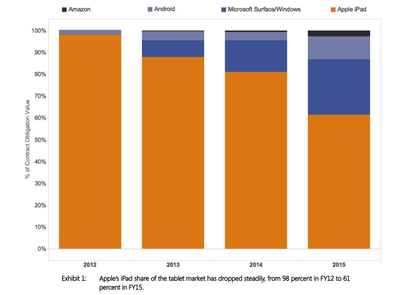 尽管就目前而言微软在平板上的销量依然无法和苹果相媲美,但从整体上来看苹果销量呈现下降趋势,而Surface的销量持续攀升。根据市场调查机构Govini的分析报告,在美国市场苹果的市场份额已经从2012年的98%在2015年下滑至61%,而在相同时期微软平板的占有量已经从0%上升至25%,尤其在2015年增长非常明显,Android平板的占有率为11%。