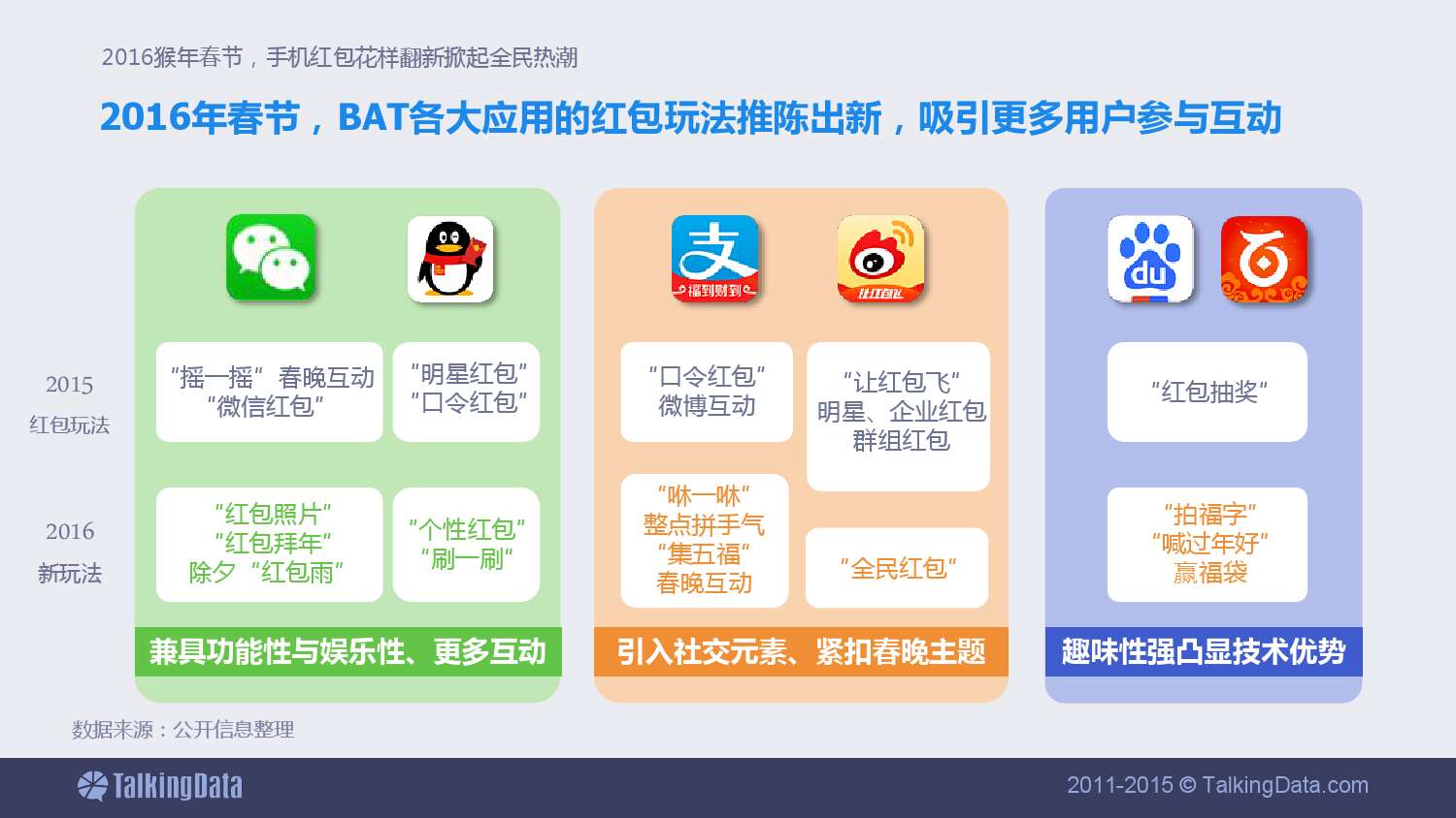 2016年春节,BAT各大应用的红包玩法推陈出新,吸引更多用户参与互动。