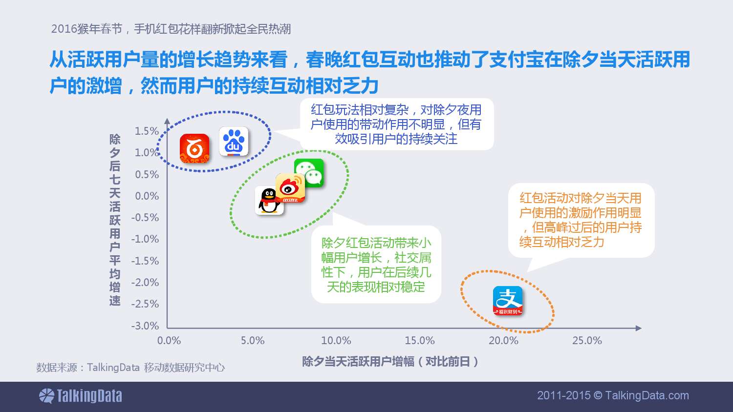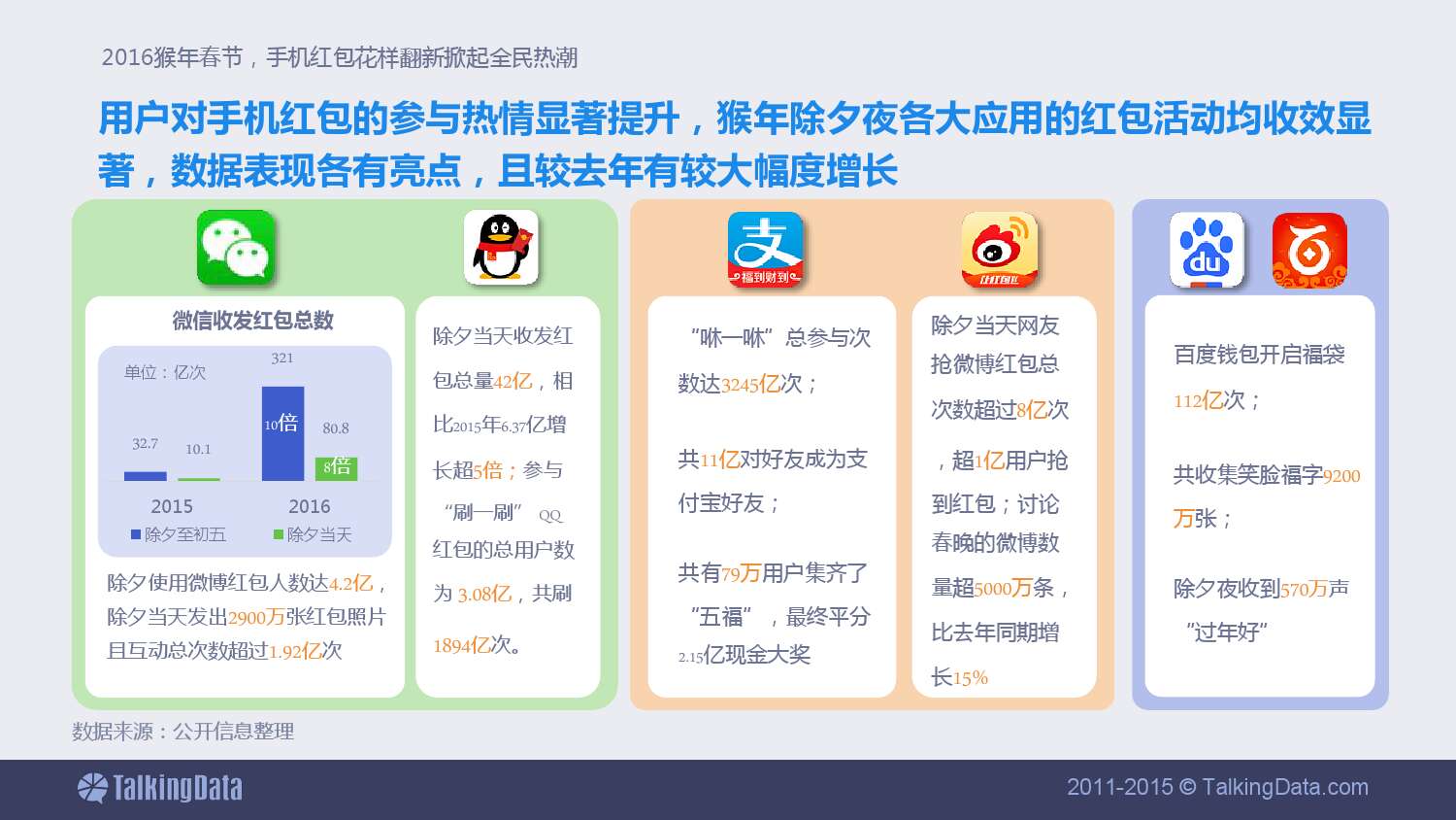 用户对手机红包的参与热情显著提升,猴年除夕夜各大应用的红包活动均收效显著,数据表现各有亮点,且较去年有较大幅度增长。