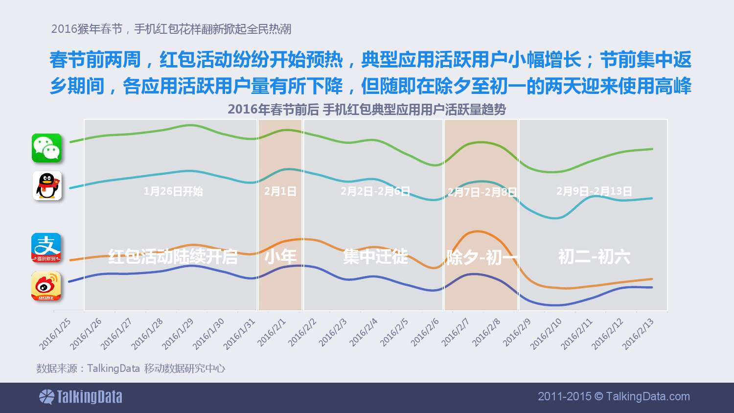 春节前两周,红包活动纷纷开始预热,典型应用的活跃用户小幅增长;节前集中返乡期间,各应用活跃用户量有所下降,但随即在除夕至初一的两天迎来使用高峰。