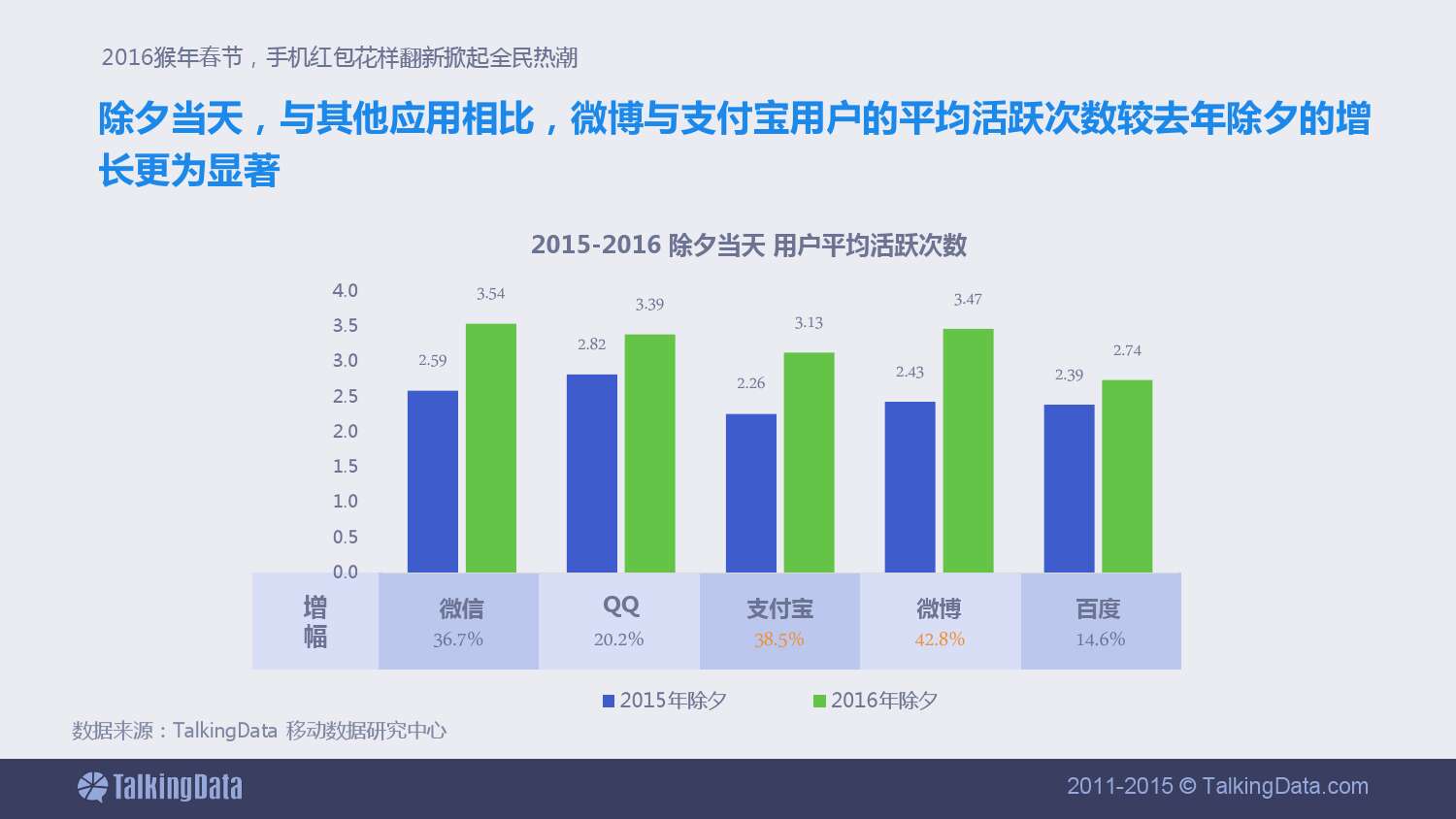 除夕当天,与其他应用相比,微博与支付宝用户的平均活跃次数较去年除夕的增长更为显著。
