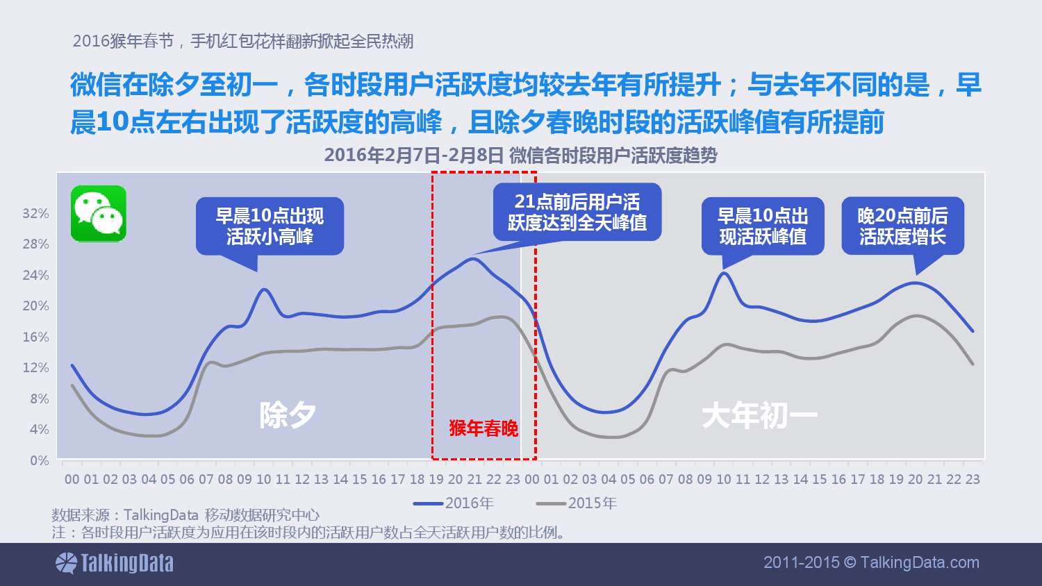 微信在除夕至初一,各时段用户活跃度均较去年有所提升;与去年不同的是,早晨10点左右出现了活跃度的高峰,且除夕春晚时段的活跃峰值有所提前。