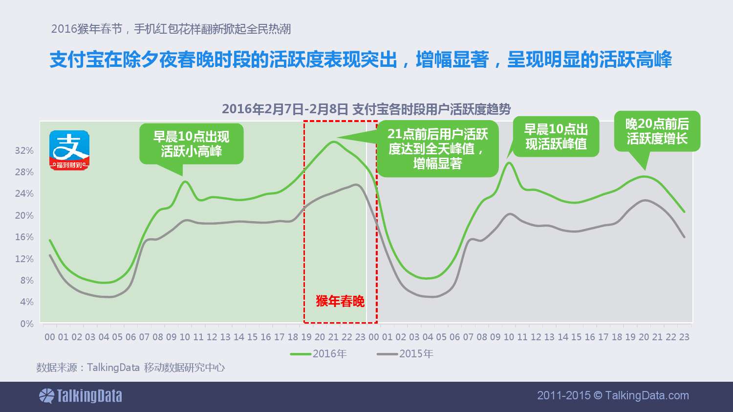支付宝在除夕夜春晚时段的活跃度表现突出,增幅显著,呈现明显的活跃高峰。