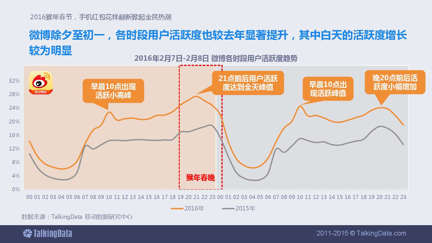 微博除夕至初一,各时段用户活跃度也较去年显著提升,其中白天的活跃度增长较为明显。