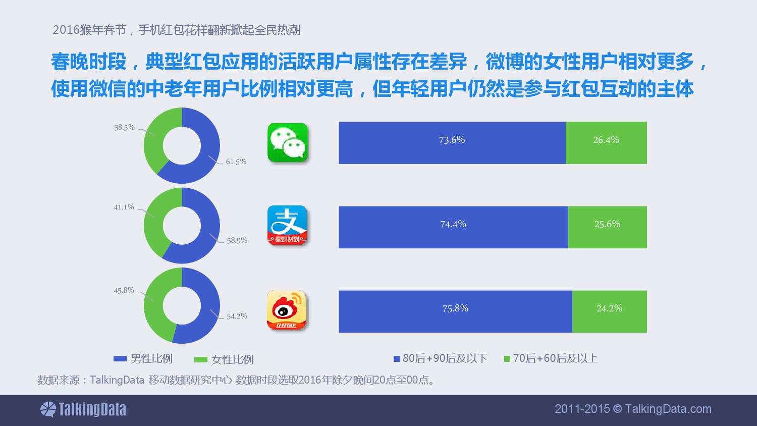 春晚时段,典型红包应用的活跃用户特征存在差异,微博的女性用户相对更多,使用微信的中老年用户比例相对更高,但年轻用户仍然是参与红包互动的主体。