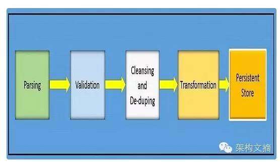 第二步,一旦数据进入大数据系统,清洗,并转化为所需格式时,这些过程都将在数据存储到一个合适的持久化层中进行。