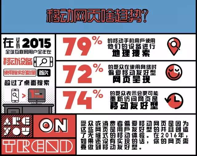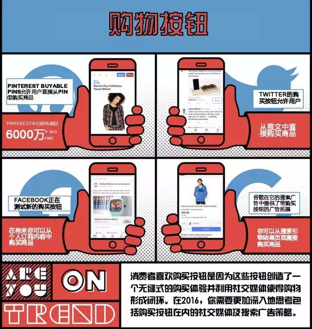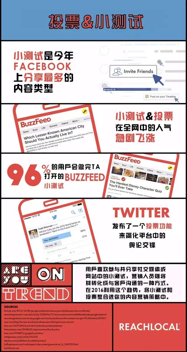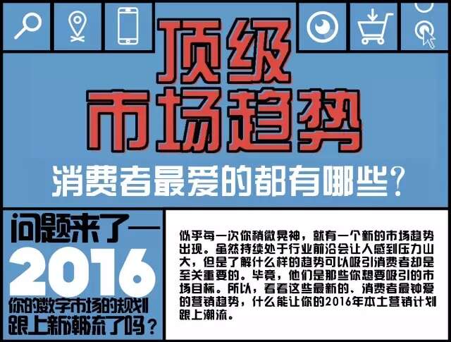 2016年全球5大顶级数字市场营销趋势 似乎每一次你稍微晃神,就有一个新的市场趋势出现。虽然持续处于行业前沿会让人感到压力山大,但是了解什么样的趋势可以吸引消费者却是至关重要的。毕竟,他们是那些你想要吸引的市场目标。 所以,看看这些最新的、消费者最钟爱的营销趋势,什么能让你的2016年本土营销计划跟上潮流。 1.移动网页趋势 2.Google 3-Pack 3.购物按钮 4.流媒体直播应用 5.投票&小测试 更多阅读:Pecan:2022年市场营销中的预测分析报告ON24:表现最佳的B2B营销人员的经验新常态:2020年及未来的市场营销报告MarketingCharts: 仅1/2 B2B营销人员表示营销带给业务的经济价值很明朗纽约美国营销协会报告:营销的未来德勤&CMO Council:2021年消费者经济报告ITSMA报告:重新思考ABM(基于账户的市场营销)的下一个机会eMarketer:预计2013年美国市场营销将减少在传统媒体投放Salesforce Research:2017年年度营销状况报告MarketingLand:内容营销攻坚期4个策略ClickZ:品牌如何运用Twitter做市场营销eMarketer:市场营销费用将转移到三大领域市场营销与大数据–数据信息图CTR:2023年广告市场营销趋势CTR:中国广告市场营销呈现三大趋势