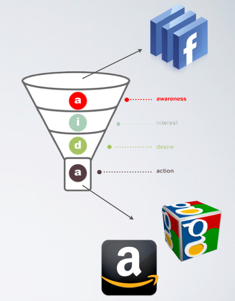 货币化模式:好产品如何恰当被货币化,是投资互联网公司需要考虑的第二层问题。从眼下可见的互联网公司货币化模式来看,我们总结,挣取客户的销售预算的模式总是优于挣取市场营销预算的模式。现阶段 Facebook 所采取的展示广告(从形态上看,一般被称为区别于品牌广告的“精准广告”,前者以 banner ad 为代表)盈利模式,还远不如以谷歌和亚马逊为典型的、直接以交易为目标的广告。通用型社交平台的一个通病是,在从触发消费到实现交易的链条(如下图,“sales funnel”)上,它们所处的总是比较不利的漏斗上方。所以 Facebook 目前依然只是在挣取客户的市场预算,谷歌、亚马逊挣取的是销售预算——前者太容易被砍掉(日前,通用汽车刚刚宣布将削减用于 Facebook 的营销预算 //news.imeigu.com/a/1337279103008.html ),而后者理论上是没有明显上限的。