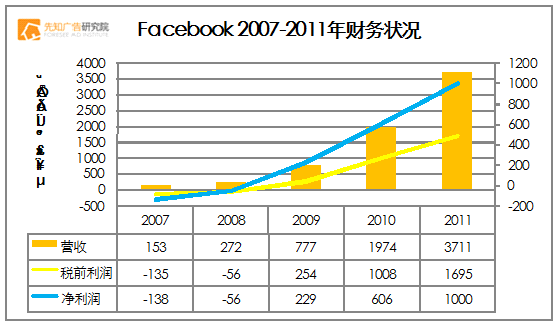 作为全球最大社交网站,成立时间8年,由3,000多名20多岁员工组成,Facebook 2011年在37.1亿美元营收上实现了10亿美元净利润,营收比上一年(2010年)增长87%,而2010年当年的营收规模,是2009年的两倍多;2009年,Facebook 成立第5年时,这家公司开始转亏为盈,净利润大幅转正。截至2011年四季度,Facebook 持有39.1亿美元的现金、短投和有价证券。
